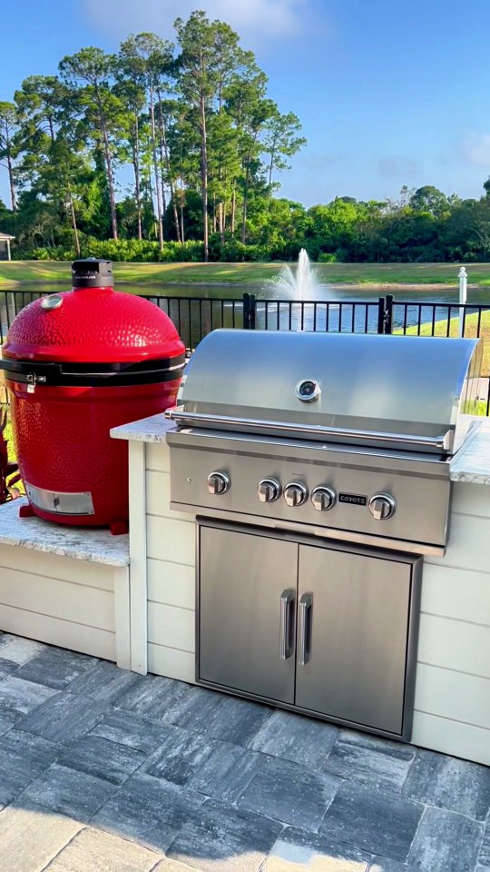 Check out this epic white outdoor kitchen with an eye-popping red smoker, perfectly situated by a serene neighborhood lake. ๐โจ Imagine cooking up some delicious food while enjoying gorgeous lake viewsโwhatโs better than that? Nothing! ๐