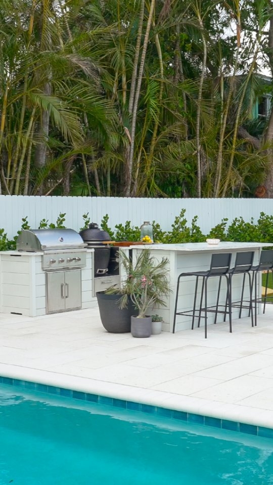 This backyard nails the ultimate Florida vibe with a fresh white color palette, a sparkling blue pool ๐โโ๏ธ, and a stunning white plank outdoor kitchen with TWO islands. ๐ Designed to feel like youโve stepped into a 5-star resort, this space proves that luxury can be right in your backyard. ๐ดโจ