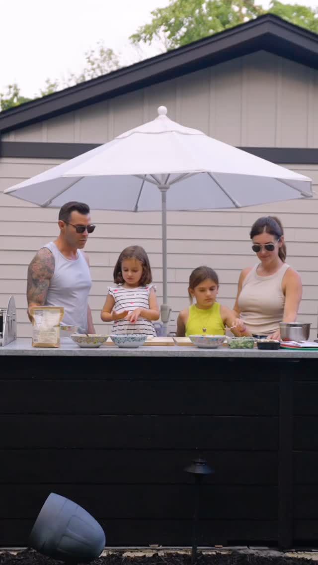 The Colenari Family is enjoying the perfect spring afternoon, surrounded by fresh basil ๐ and the savory scent of pizza cooking in their black plank outdoor kitchen. ๐ก With plenty of counter space, thereโs room for the ultimate pizza partyโand so much more! ๐๐